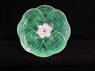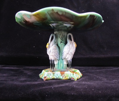 Rare 1800's English Majolica pedestal centerpiece with three storks on base rising to a white pond lily - 6" tall, 9.25" wide, no signature not unusual for this time period.  Possible attribution to Holdcroft.  Same piece in the San Francisco Fine Arts collection.   Very fine color and glaze.