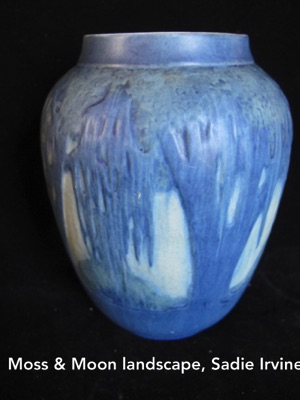 Moss & Moon Landscape, signed Sadie Irvine, potter Jonathan Browne Hunt, circa 1920's, 6.75" high, 6"width - perfect.