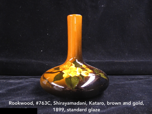 Rookwood Pottery production began in 1880 and was named Rookwood, after the founder, Maria Longworth Nichols’ childhood home bringing her experience gained from her efforts first painting china in 1873. Although the pottery pieces were now being produced by a formal decorating department which was expanding and selling all it could produce, the pottery was not financially successful. A new partner and administrator, William Watts Taylor in 1883 started keeping records of popular pieces and instituted marketing changes. Laura A. Fry, who worked in the early Rookwood School for Pottery Decoration discovered the Rookwood Standard Glaze in 1883 which became quite successful. Rookwood continued to develop new types of wares, glazes and designs. The Japanese artist, Kataro Shirayamadani, joined the pottery’s decoration studio, and by the end of 1888 the firm was able to pay back the losses of the earlier years.