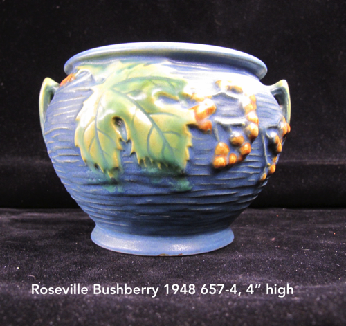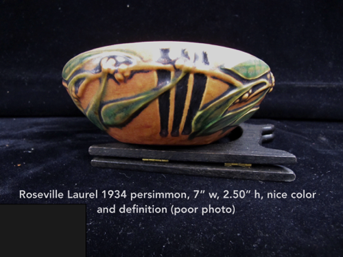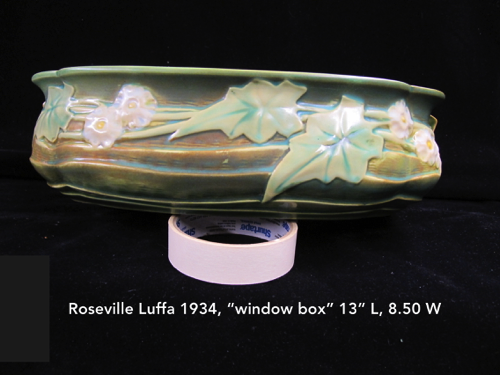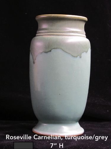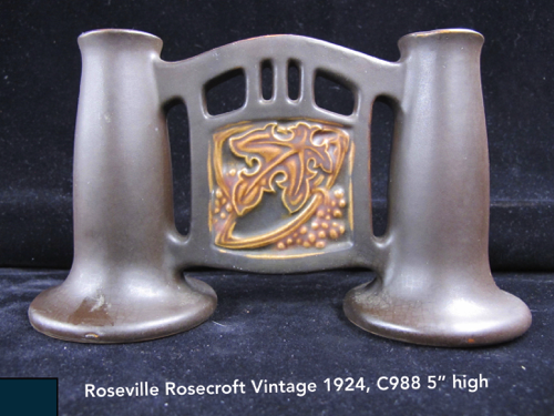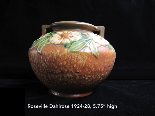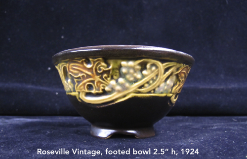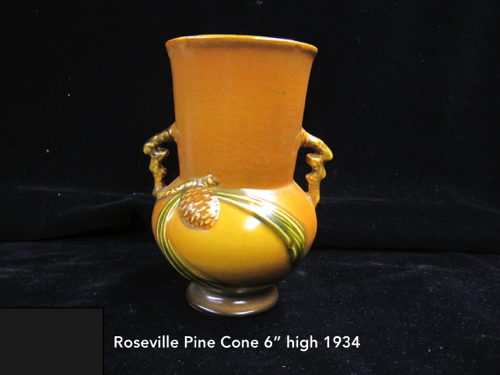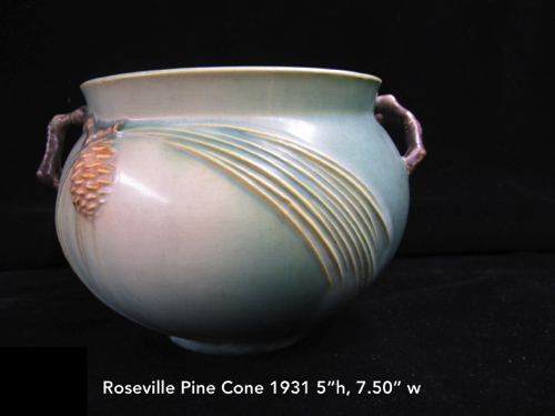 In 1917 Frank Ferrell was hired as the art director and remained at Roseville until 1954. He developed the Pine Cone line derived from ideas he had suggested at Weller. It became the most popular line ever made at Roseville. In 1918 the new trademark “Roseville U.S.A.” was adopted when Russell T. Young took over as general manager. In 1931 Russell’s mother became president and the firm name was changed to Roseville Pottery. The firm continued to make production ware until 1954 when all the designs and contents were sold.