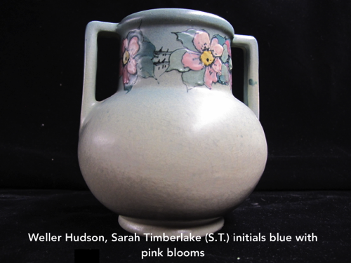 Hudson line, two handled vase, Sarah Timberlake (S.T.) initials blue with pink flowers around neck of vase, line was produced from early 20's to mid-30's, lovely piece