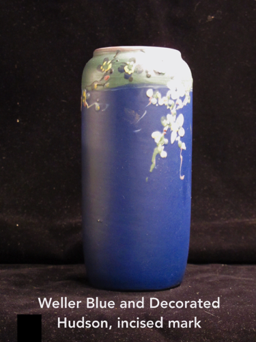 Blue and decorated Hudson (incised Weller), 7.5" high, blue body with different blue/green on rim lovely white flowers with pink accents