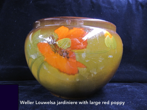 Louwelsa 445 (incised) is 9.50" high with orange flowers, very nice work. The Louwelsa line was introduced by William A. Long in 1895