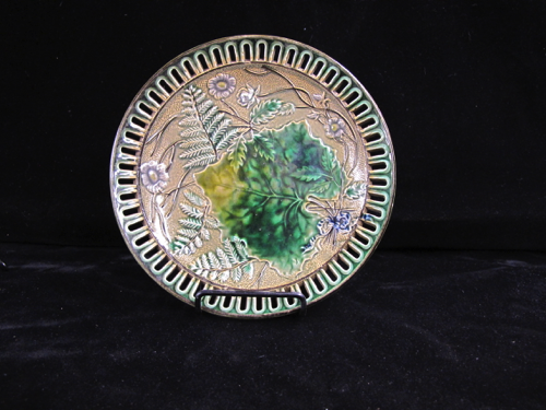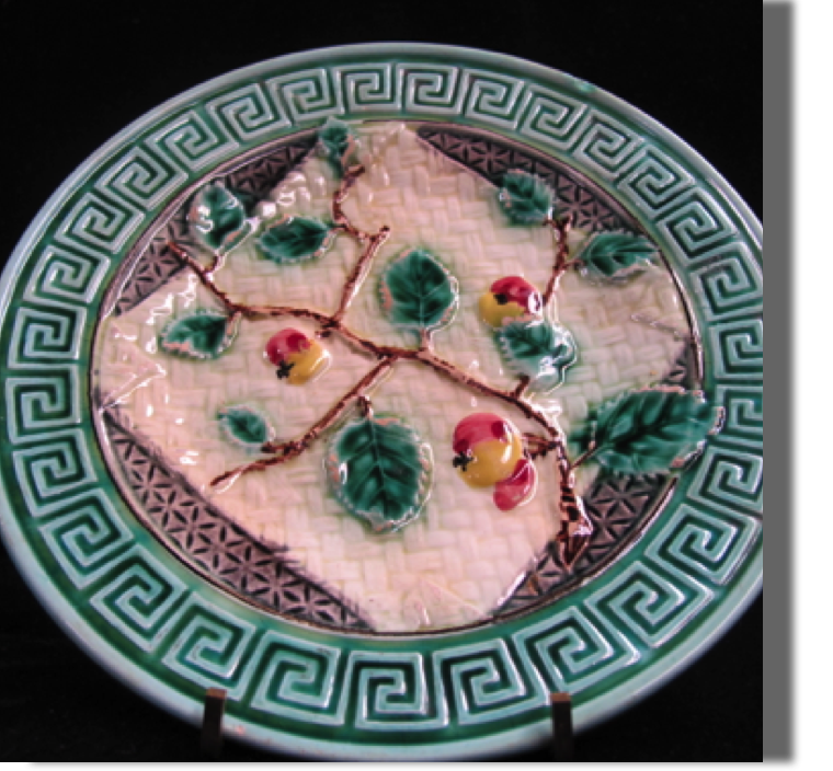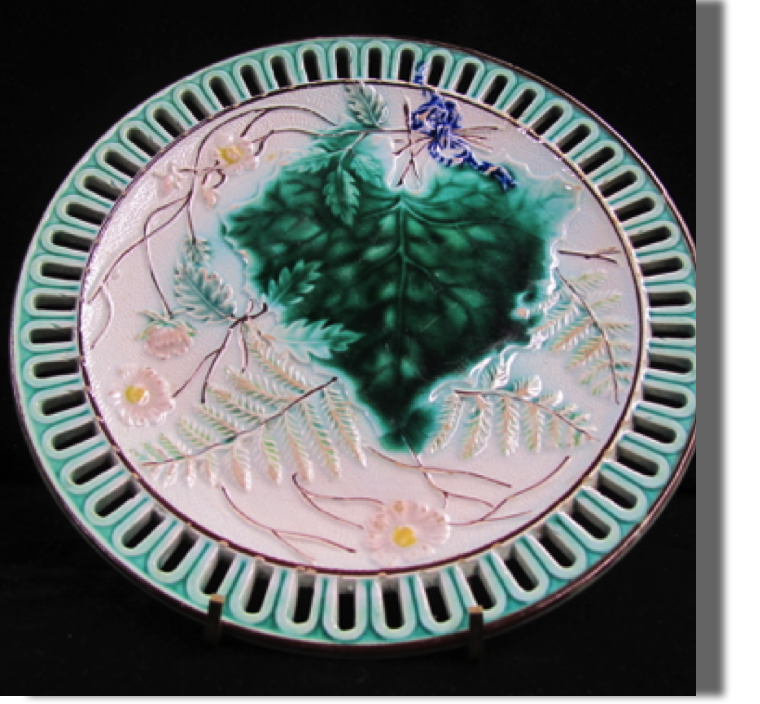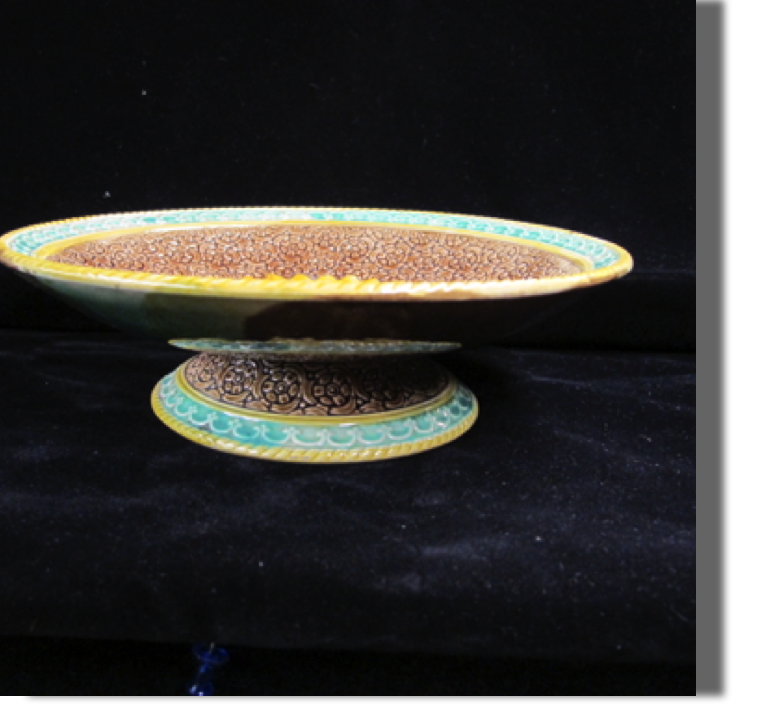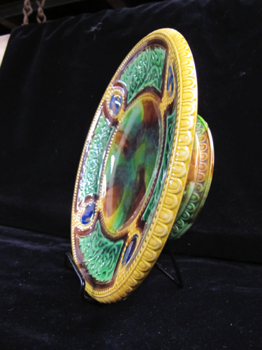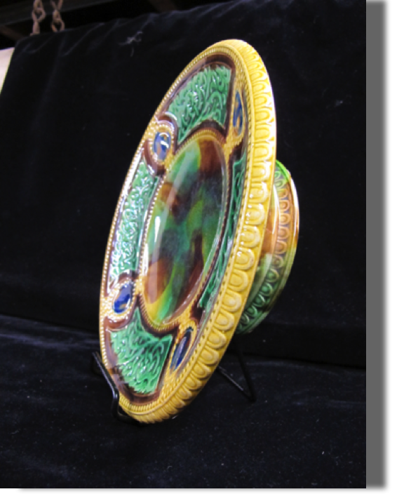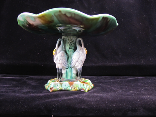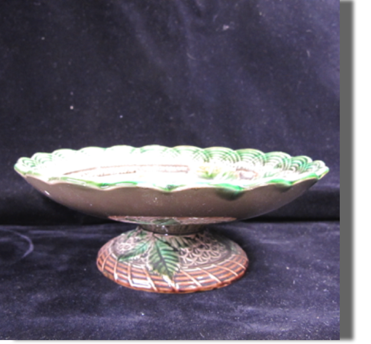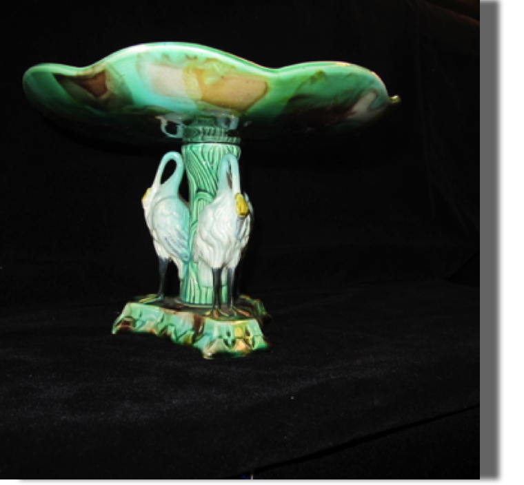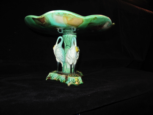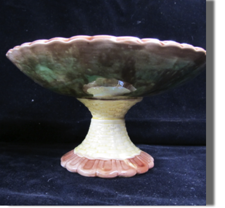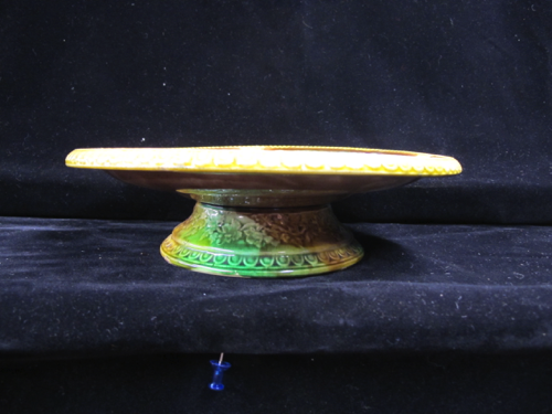 See brief history of majolica at end of page...offerings include objects both from England and America, let us know of an item you have an interest in and we will get to you measurements/price and any additional information you would like... all pieces are mint unless noted in description...our collection started with cake stands, and there are several fine examples in our offerings...