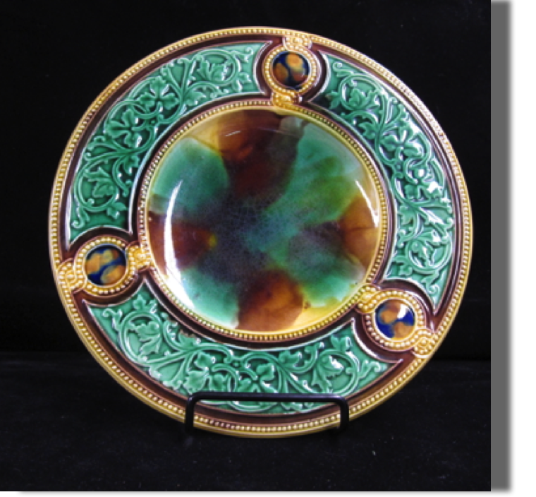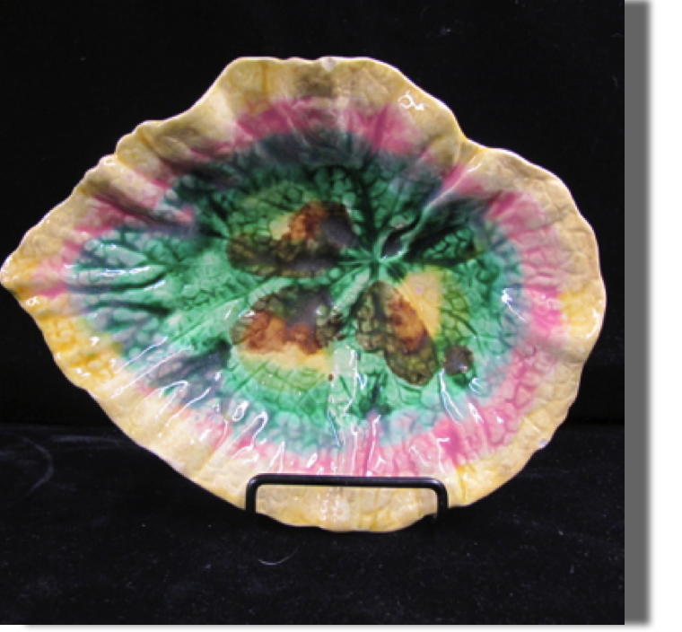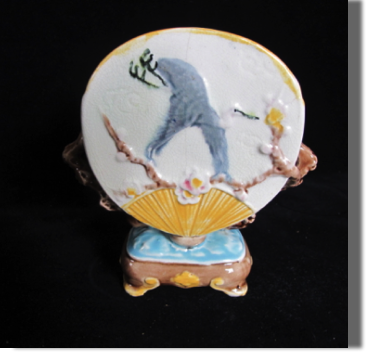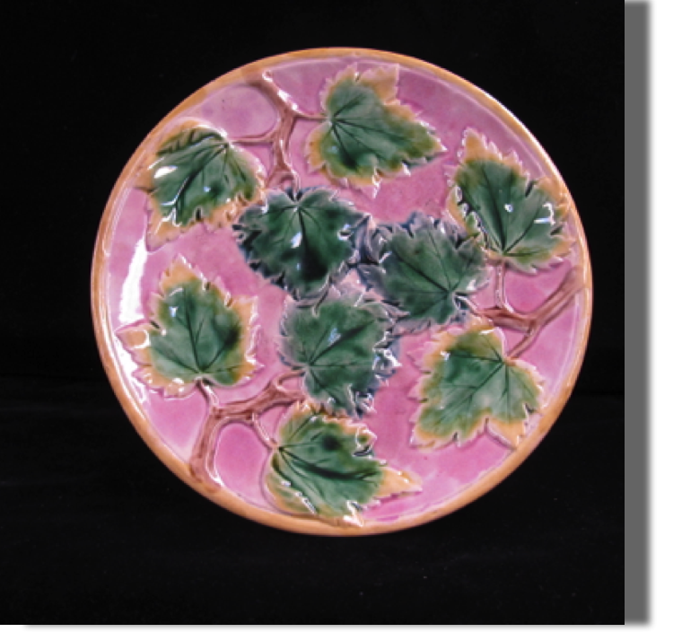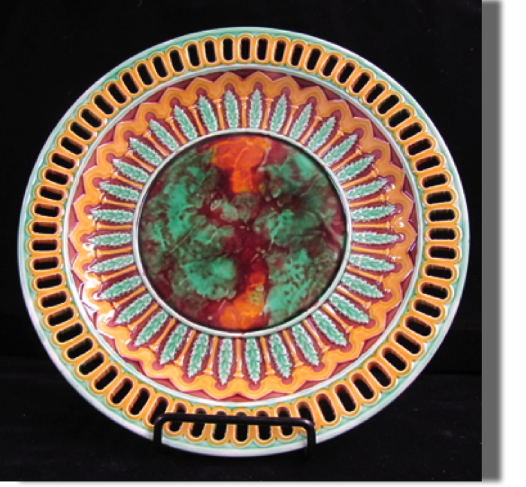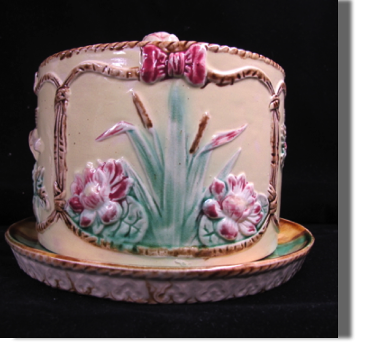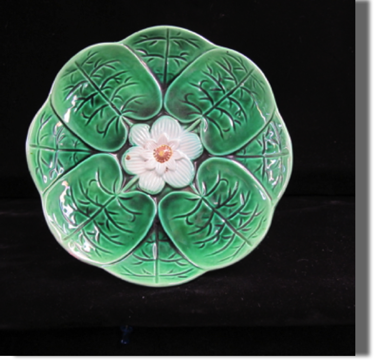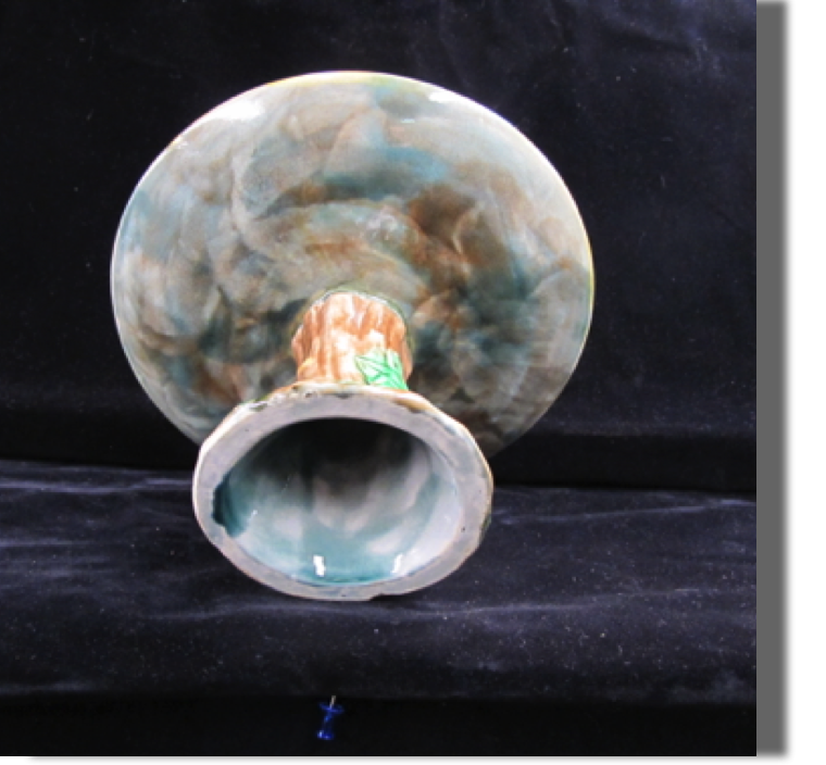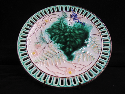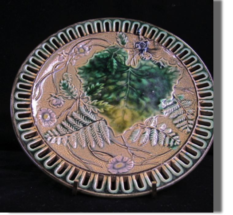 See brief history of majolica at end of page...offerings include objects both from England and America, let us know of an item you have an interest in and we will get to you measurements/price and any additional information you would like... all pieces are mint unless noted in description...our collection started with cake stands, and there are several fine examples in our offerings...